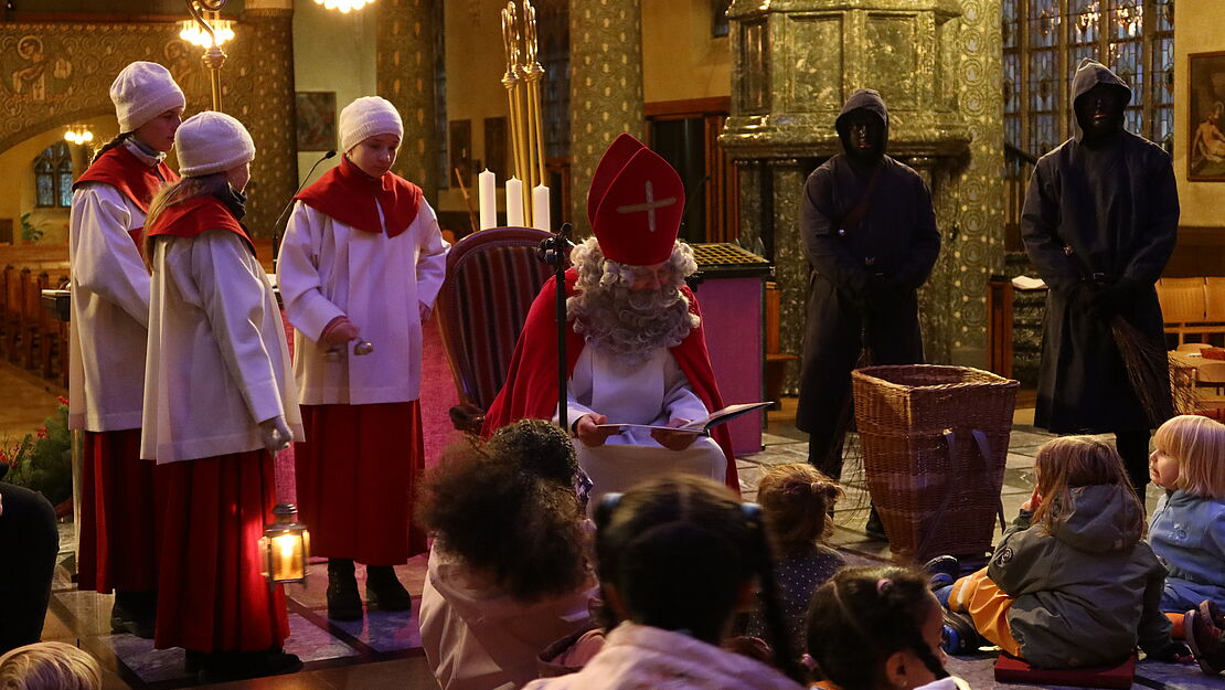 Um 16.30 Uhr versammelten sich eine Schar Kinder und ihre Begleiter:innen im Chorraum der Pauluskirche und warteten gespannt auf den Samichlaus. In Begleitung seiner Dienerinnen und den Schmutzli setzte sich der Chlaus zu uns in den grossen Kreis. Die spannende Geschichte vom Siebenschläfer Glisglis, welche der Samichlaus erzählte, entführte uns in den tiefen Wald zu den Wildtieren. Der kleine Siebenschläfer Glisglis hätte beinahe schon wieder den Samichlaus verpasst, wenn ihn nicht die aufmerksame Eule rechtzeitig geweckt hätte. Endlich konnte Glisglis den Samichlaus kennenlernen und er war überglücklich, dass der Samichlaus ihm Aufmerksamkeit, Freundlichkeit und etwas zum Naschen schenkte.