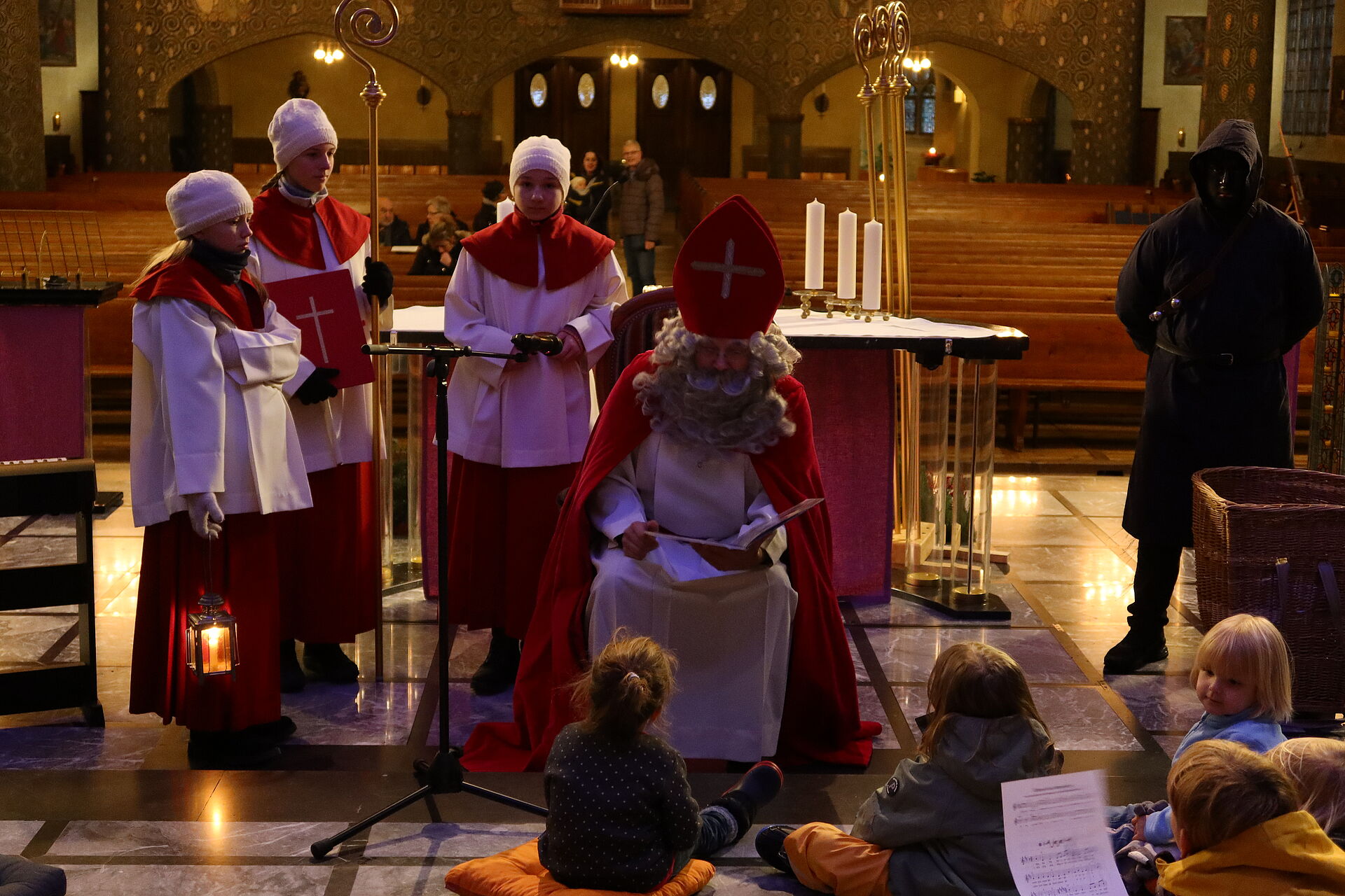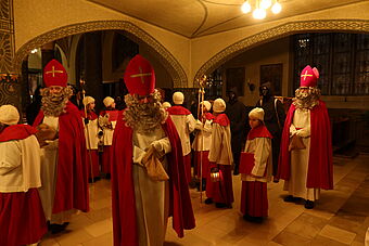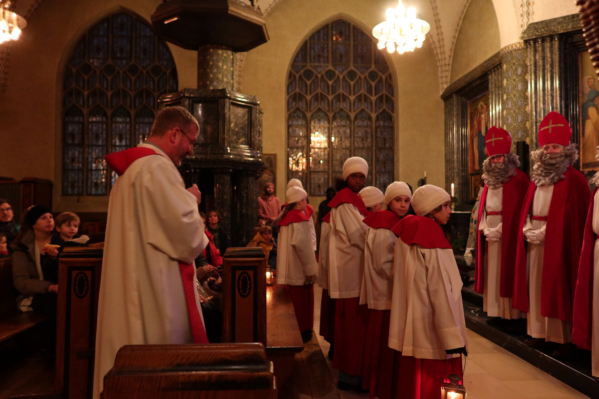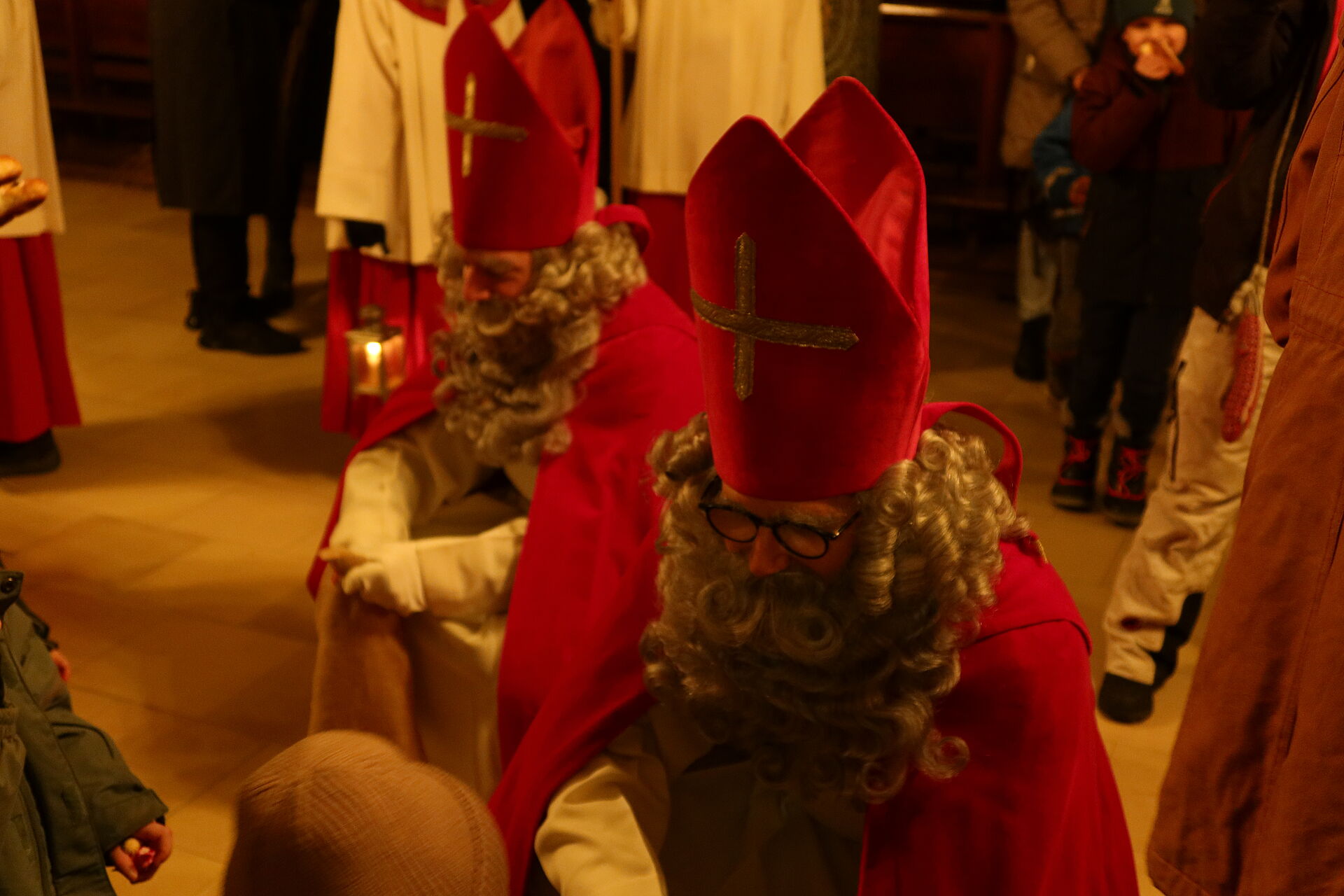 Als wir schon dachten, nun sei bald alles vorbei, ging es erst so richtig los: Staunend konnten wir nun sehen, dass noch 6 weitere Samichläuse in die Kirche einzogen. Na, klar, ein einziger Chlaus kann unmöglich alle Kinder in der Stadt besuchen. Pfarrer Rafal Lupa überreichte allen Samichläusen das grosse, rote Buch und den goldenen Bischofsstab, segnete sie und sandte sie aus zu den Familien, die daheim auf sie warteten. Der Segen Gottes möge alle Kinder und alle erwachsenen Menschen begleiten, hier und überall auf der Welt.