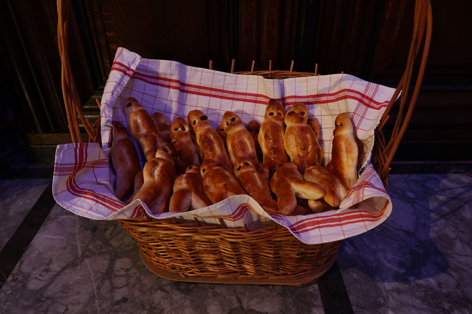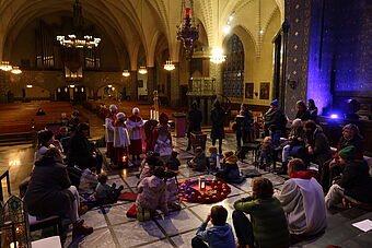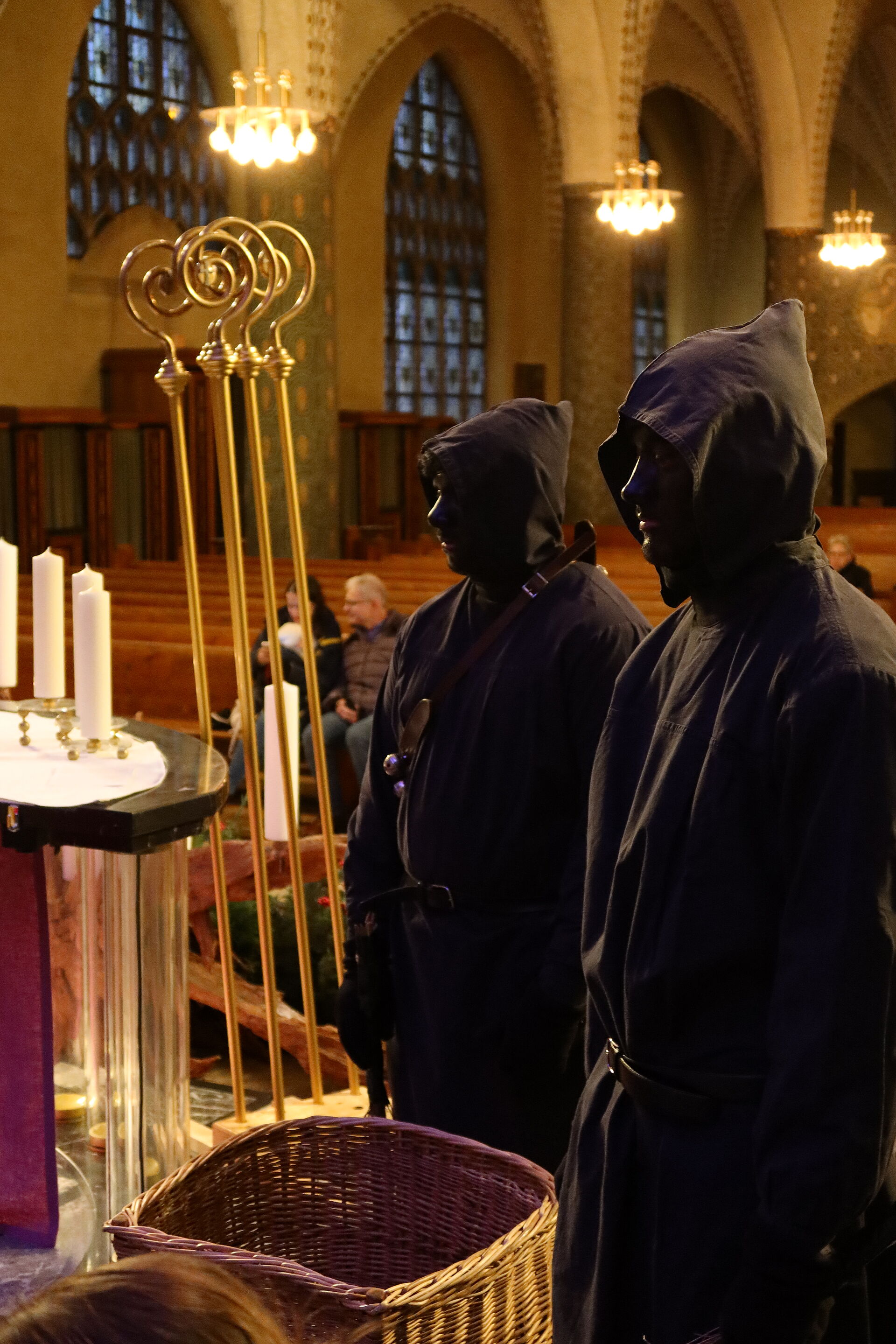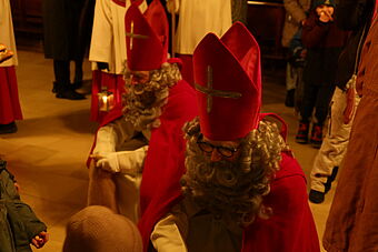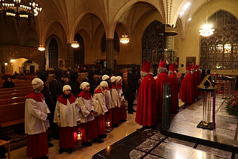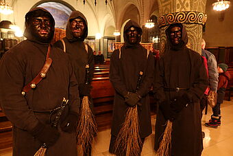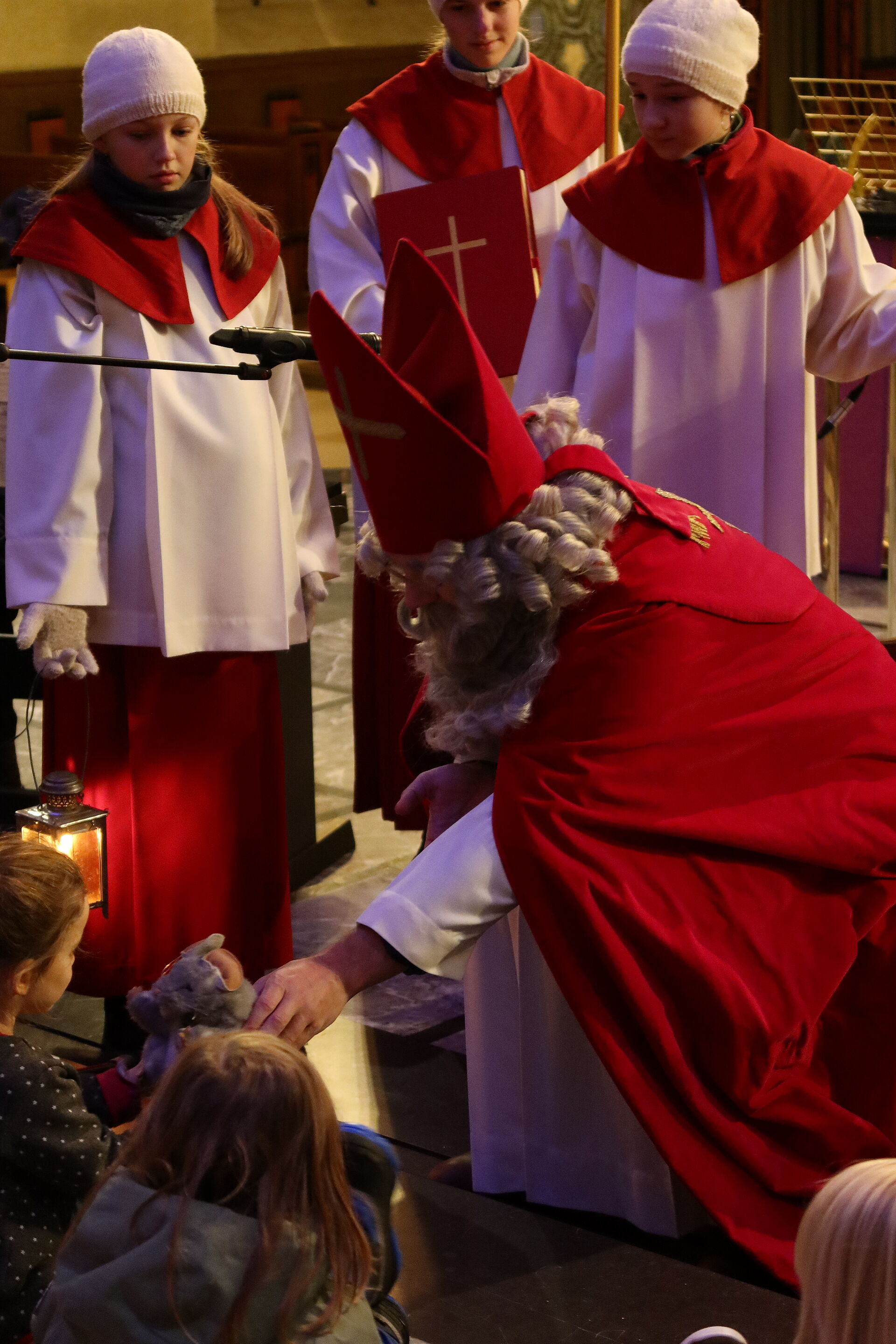 Als wir schon dachten, nun sei bald alles vorbei, ging es erst so richtig los: Staunend konnten wir nun sehen, dass noch 6 weitere Samichläuse in die Kirche einzogen. Na, klar, ein einziger Chlaus kann unmöglich alle Kinder in der Stadt besuchen. Pfarrer Rafal Lupa überreichte allen Samichläusen das grosse, rote Buch und den goldenen Bischofsstab, segnete sie und sandte sie aus zu den Familien, die daheim auf sie warteten. Der Segen Gottes möge alle Kinder und alle erwachsenen Menschen begleiten, hier und überall auf der Welt.