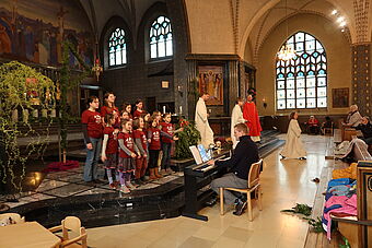 Die Feier wurde musikalisch von den Paulusspatzen gestaltet. Ihre Lieder drücken die Freude des Festes von Palmsonntag erfahrbar aus. Anschliessend bekamen alle einen Palmstrauss von der Jungwacht für zu Hause. Möge die Freude vom Palmsonntag uns in die kommende Karwoche hinein begleiten.