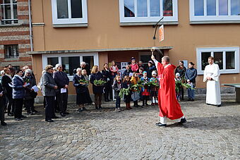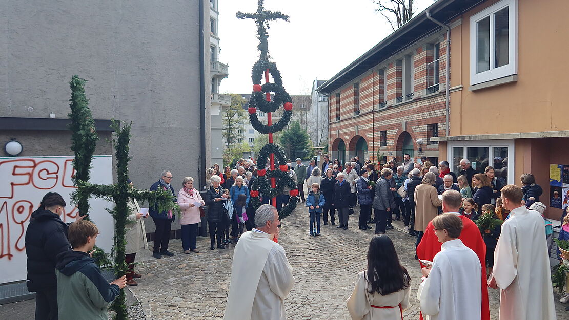 Die Feiern begannen draussen bei strahlendem Sonnenschein, die uns in den Regenpausen geschenkt waren. Wir segneten die Palmzweige, die wir selber oder die Jungwächter von St. Paul für uns gebunden haben. Danach zogen wir gemeinsam in einer Prozession in die Kirche ein.