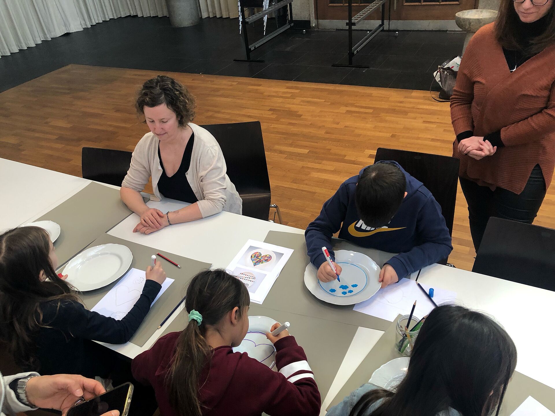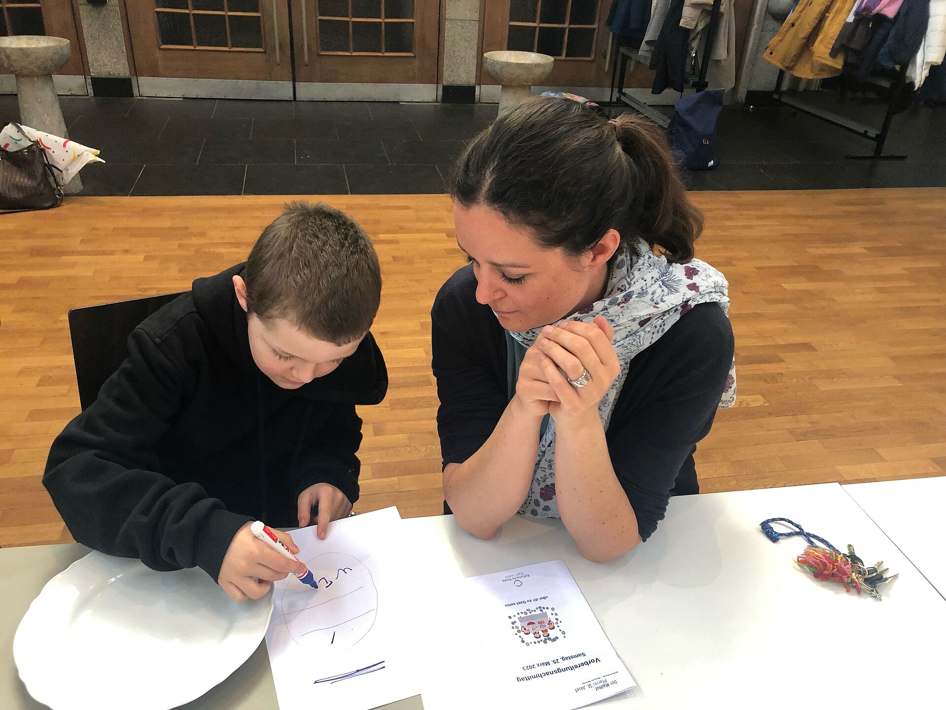 In verschiedenen Ateliers arbeiteten die Kinder und ihre Eltern zum Thema «Bei dir zu Gast sein». Sie haben Lieder eingeübt, die wichtigsten Informationen zur Erstkommunion bekommen, Spiele gespielt und dabei viel Spass gehabt. Mit grosser Freude durfen auch die Erstkommunionkleider anprobiert und dann mit nach Hause genommen werden. Die Kinder bemalten mit ihren Eltern zusammen einen Teller für die Dekoration des Kirchensaals am Erstkommuniontag. Am Schluss des Nachmittags genossen wir den Kaffee und Kuchen zusammen.
