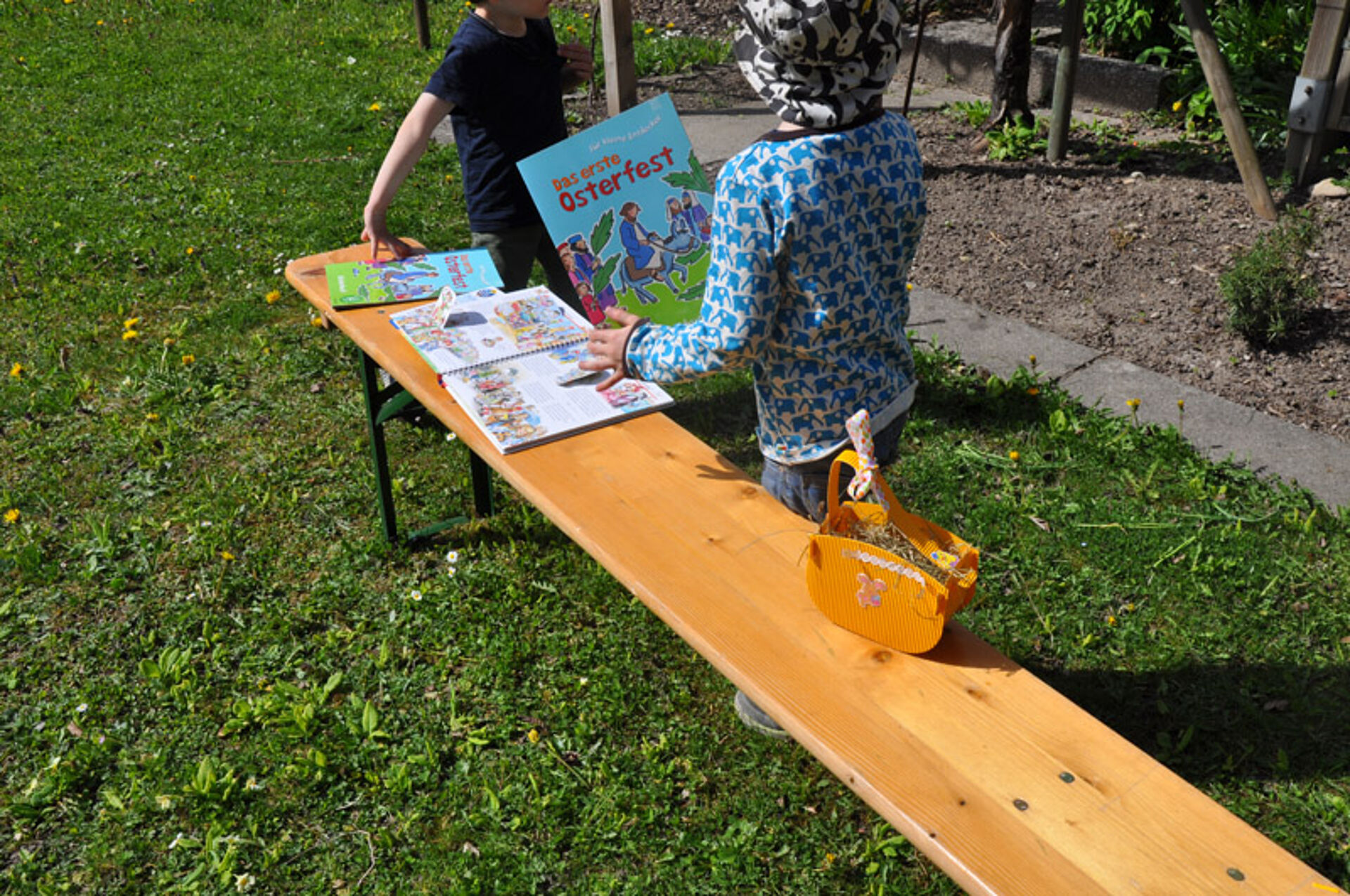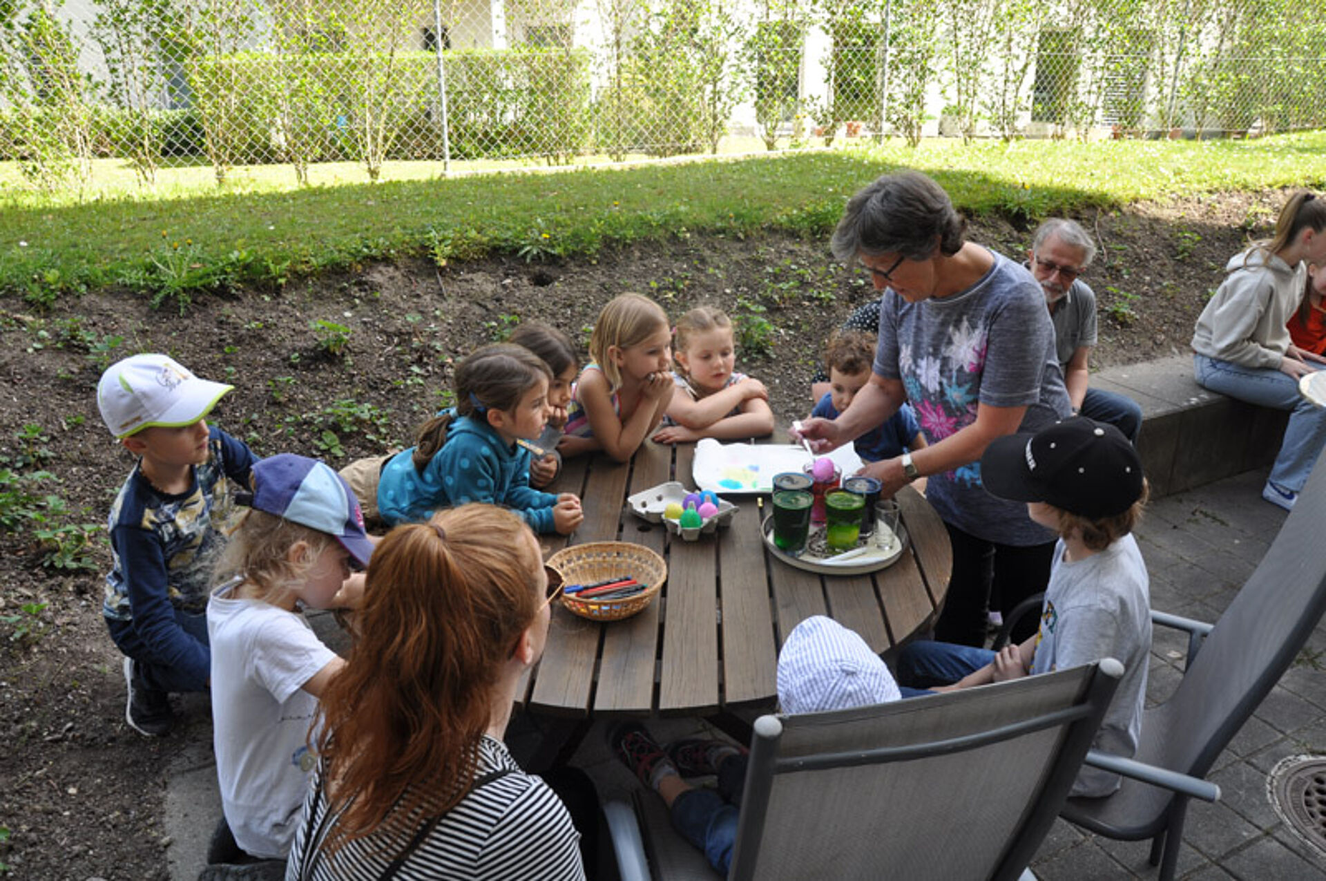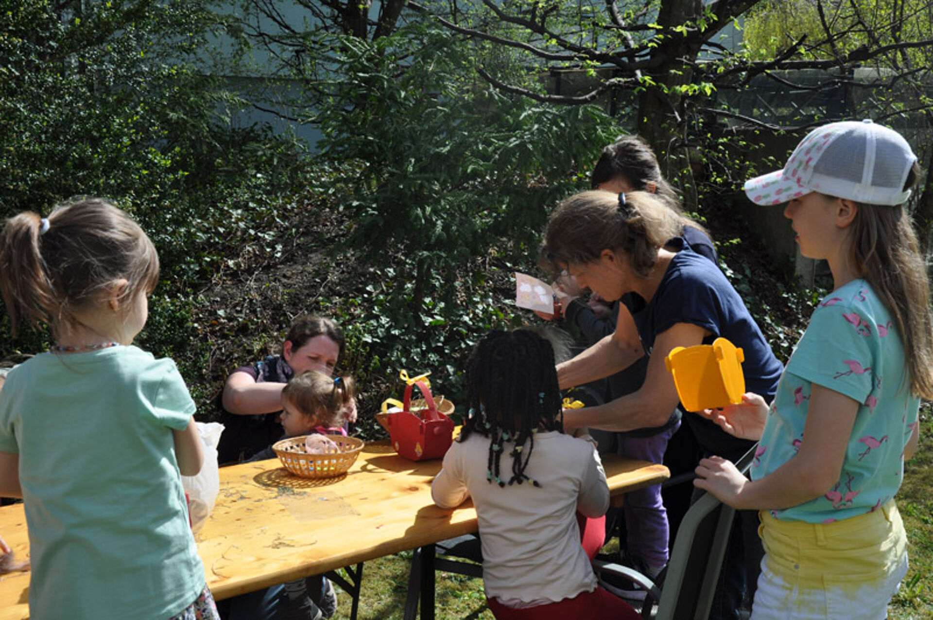 Kurz vor halb drei Uhr trafen die Kinder und Erwachsenen zur Begrüssung im Paulusheim ein. Eine fröhliche Stimmung verbreitete sich schon bald darauf im Pfarrhausgarten. Osternestli wurden gebastelt, Ostereier verziert und Bücher zu Ostern erzählt oder Bilder ausgemalt.