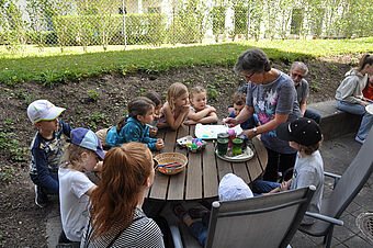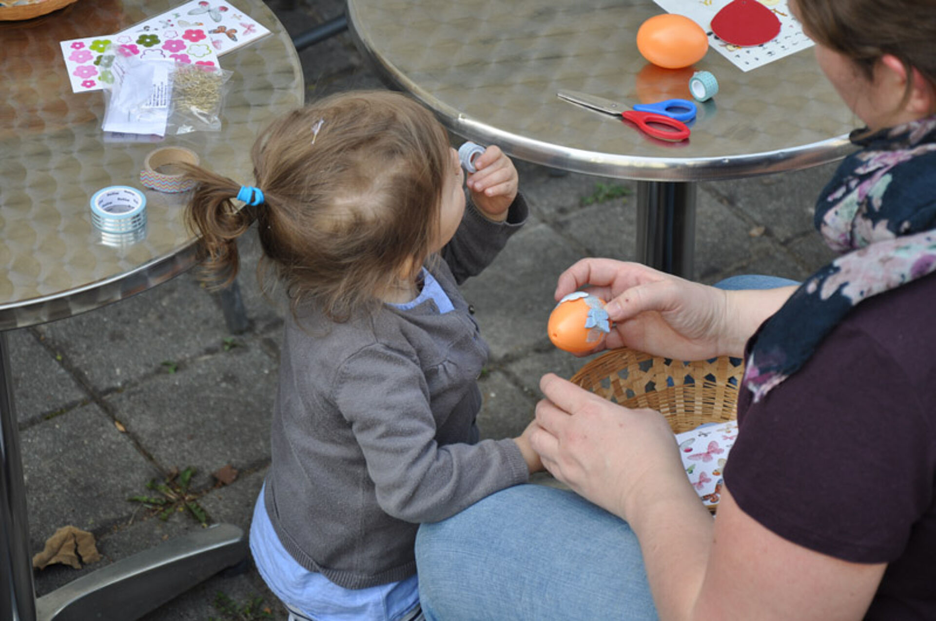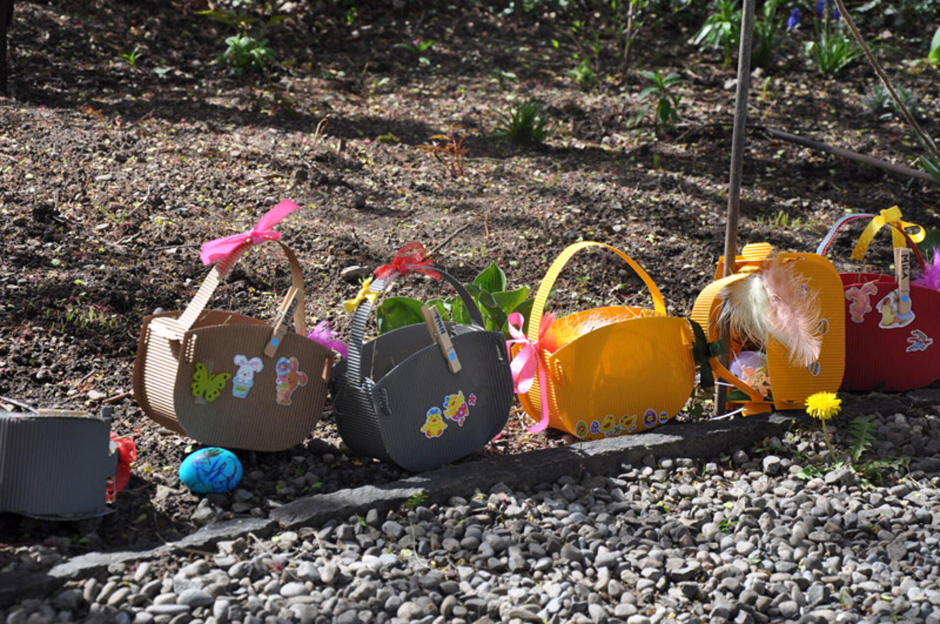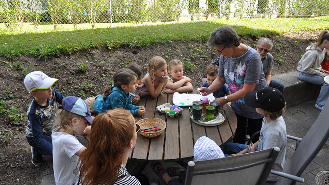 Kurz vor halb drei Uhr trafen die Kinder und Erwachsenen zur Begrüssung im Paulusheim ein. Eine fröhliche Stimmung verbreitete sich schon bald darauf im Pfarrhausgarten. Osternestli wurden gebastelt, Ostereier verziert und Bücher zu Ostern erzählt oder Bilder ausgemalt.