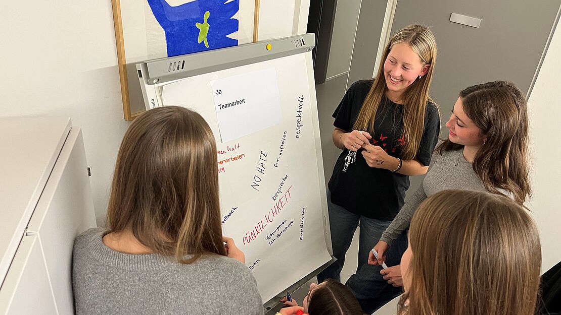 Im Zentrum des Workshops standen die eigenen Werte und die Haltung, mit der die neuen Leiterinnen und Leiter ihre Aufgabe prägen wollen. Schnell wurde klar: Ein respektvoller Umgang, eine offene und transparente Kommunikation sowie gegenseitige Unterstützung gehören für sie zu den wichtigsten Grundpfeilern ihrer Leitungsrolle. Mit viel Engagement diskutierten die Jugendlichen miteinander, erarbeiteten ihre Grundwerte und stellten die Ergebnisse aus den Gruppenarbeiten im Plenum vor. Es war eine Freude zu sehen, wie sie reflektierten, diskutierten, aufmerksam zuhörten und aktiv teilnahmen.