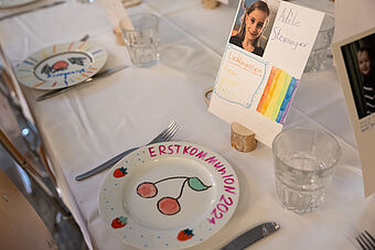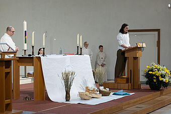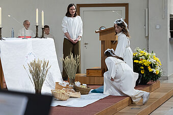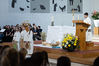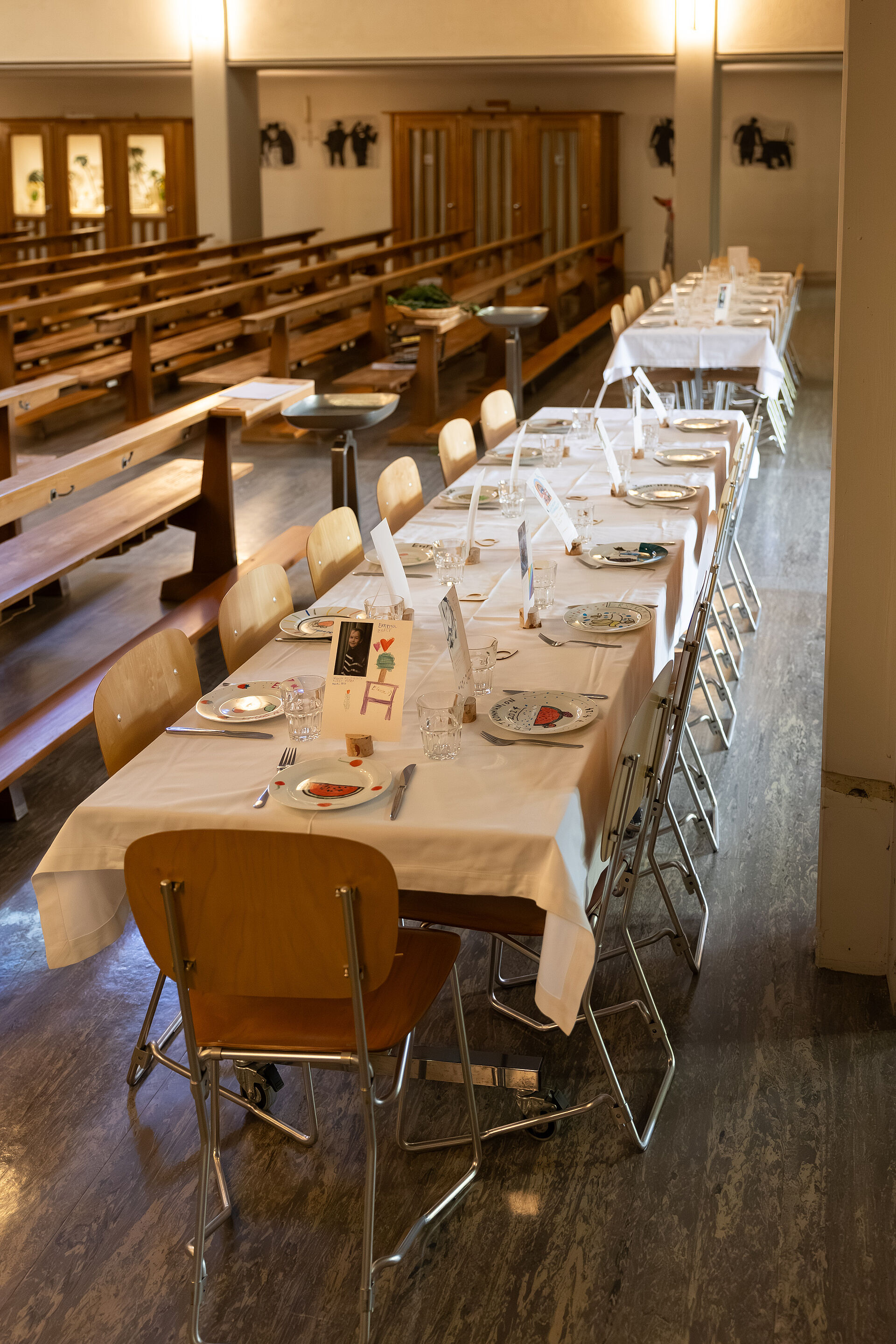 „Zäme am Tisch“, dieses Motto begleitete uns durch den Gottesdienst. Bereits am Eingang der Kirche wurden die Gäste von zwei reich gedeckten Tischen empfangen. Teller und Tischkärtchen hatten die Kinder in der Vorbereitung selber gestaltet. Die von den Kindern am Vortag gebackenen Brötchen lagen vor dem Altar bereit.