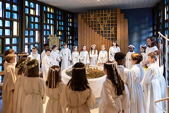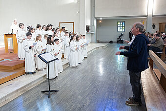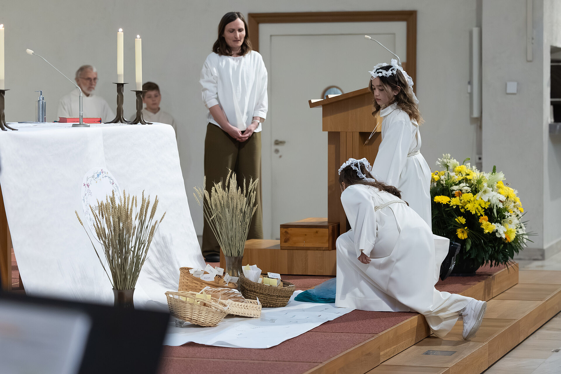 Auch inhaltlich drehte sich alles um das Zusammenkommen am Tisch. In der Geschichte „die Steinsuppe“ wurde aus einer vorerst wässrigen Brühe eine leckere Suppe. Und in der Erzählung aus dem Evangelium setzte sich Jesus ausgerechnet mit Zachäus an einen Tisch, mit dem sonst niemand etwas zu tun haben wollte. Gemeinsam, rund um den Altar, durften die Kinder schliesslich ihre erste Kommunion empfangen.