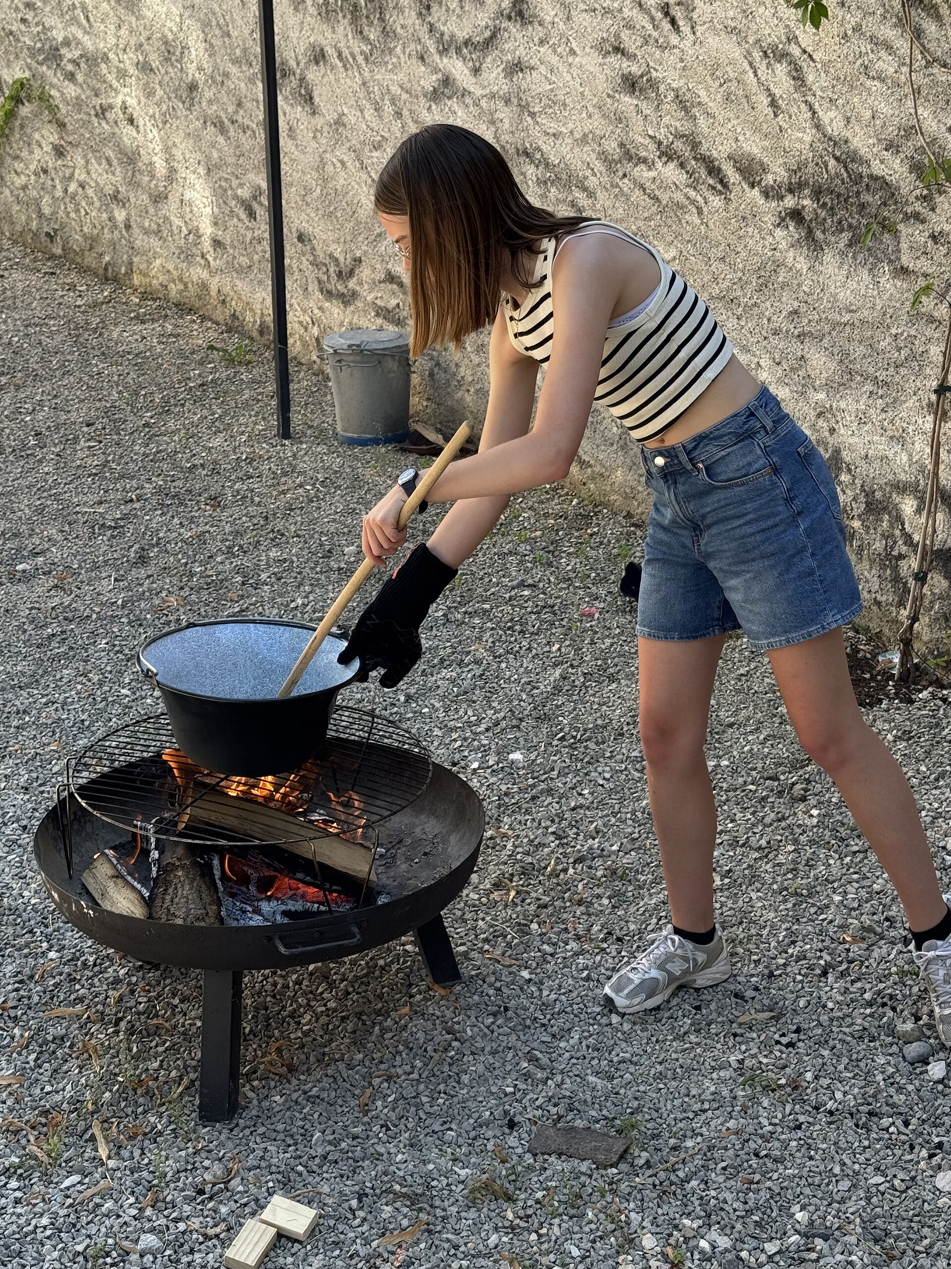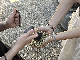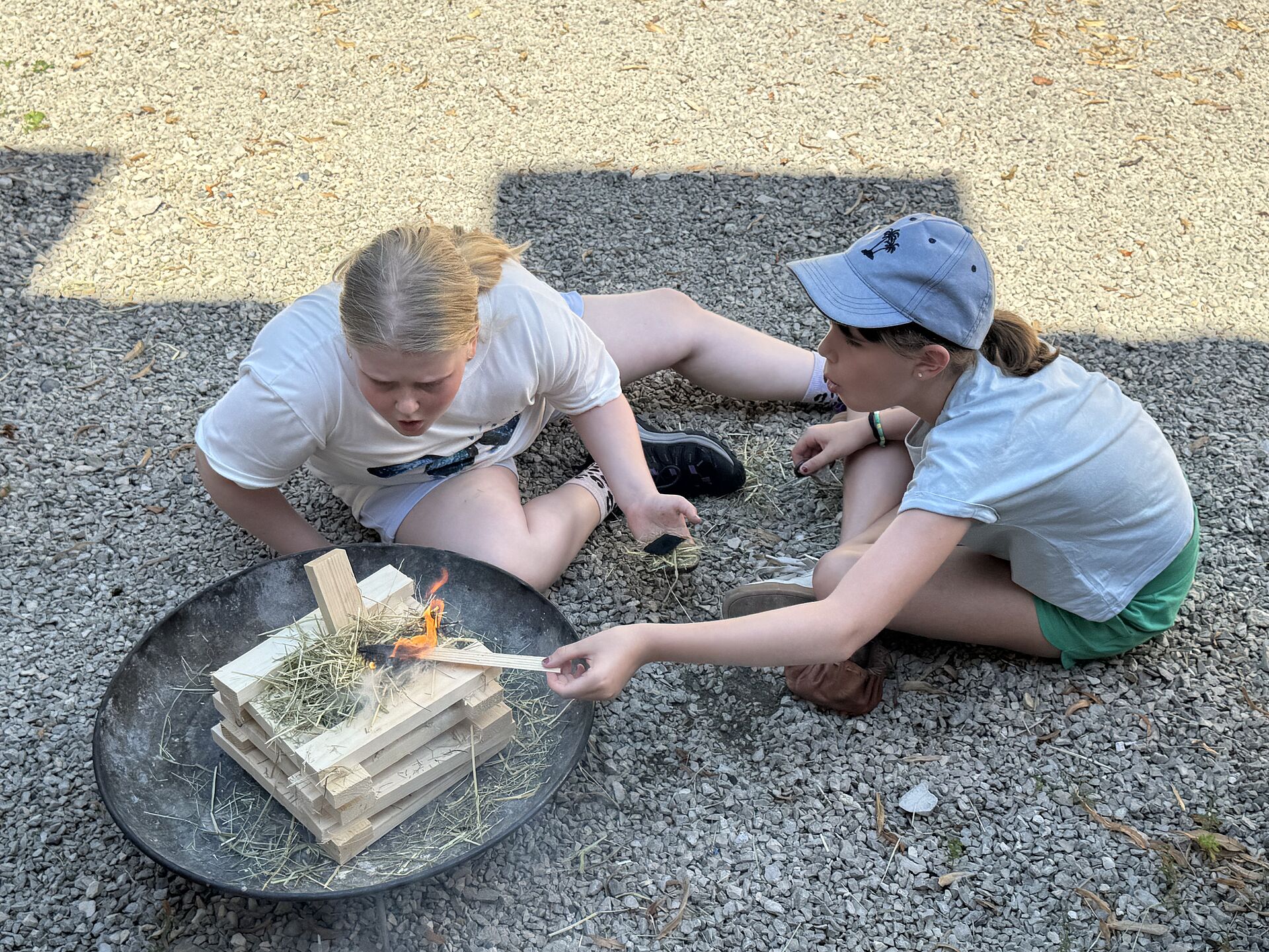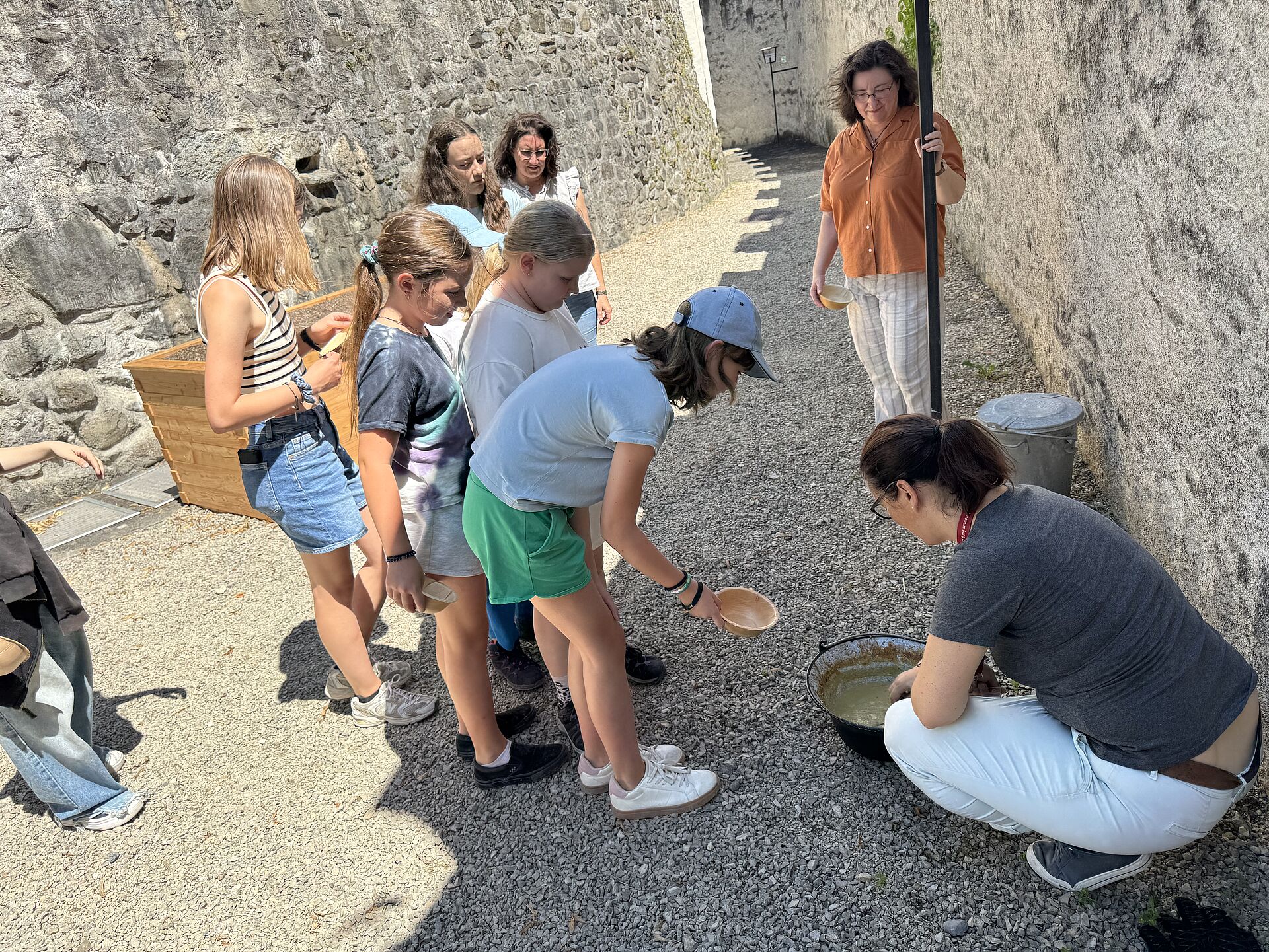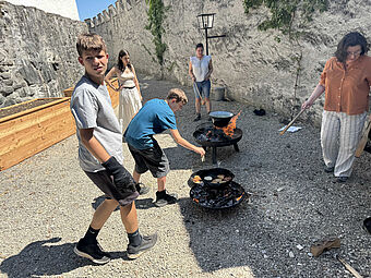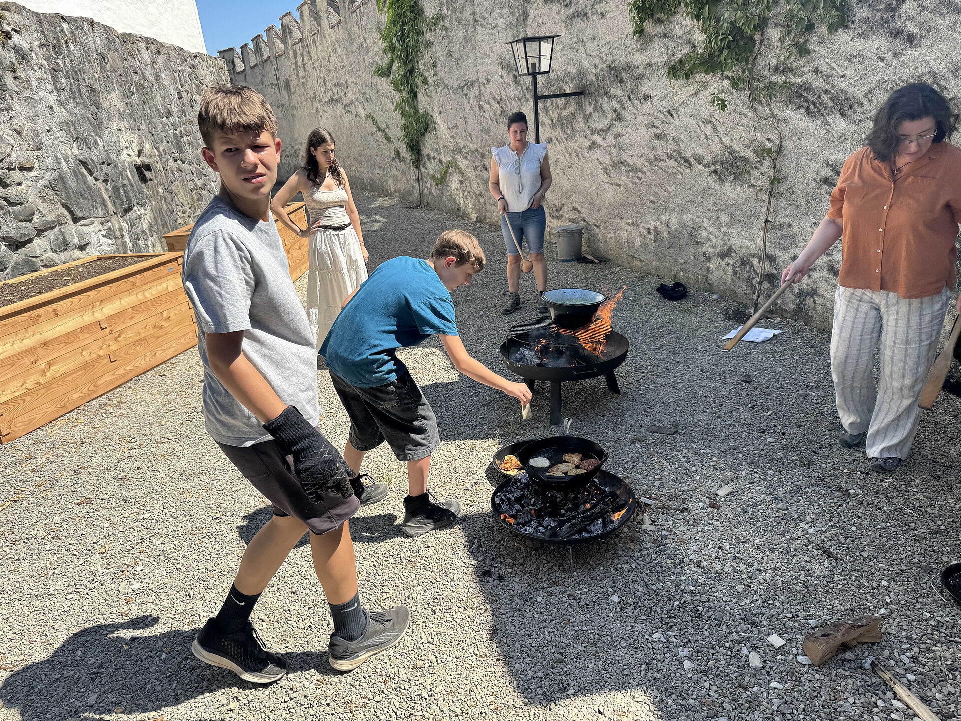 Wie begrüsst man im Mittelalter auf der Burg? Und wie im kleinen Fischerdörfchen Zug? Und wie wird Feuer gemacht für Licht im Raum, fürs Kochen und fürs Heizen? Wobei, das Heizen hätten wir uns bei 32 °C gerne gespart. Aber weil wir auch kochen übten wie im Mittelalter, brauchten wir offenes Feuer ... Das war gar nicht so einfach hin zu bekommen! Mit Feuerstein und Schlageisen wurden Funken geschlagen, die dann mit Zunder und Heu zum kleinen Feuer gefüttert wurden. Wir waren alle froh, als die Jungs es schafften, genug Funken zu schlagen.