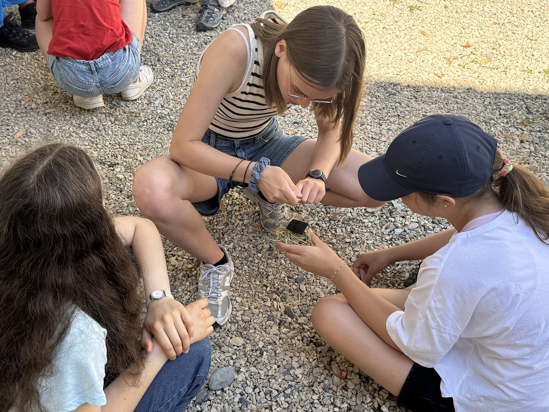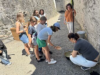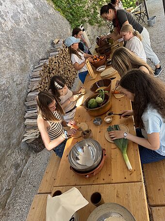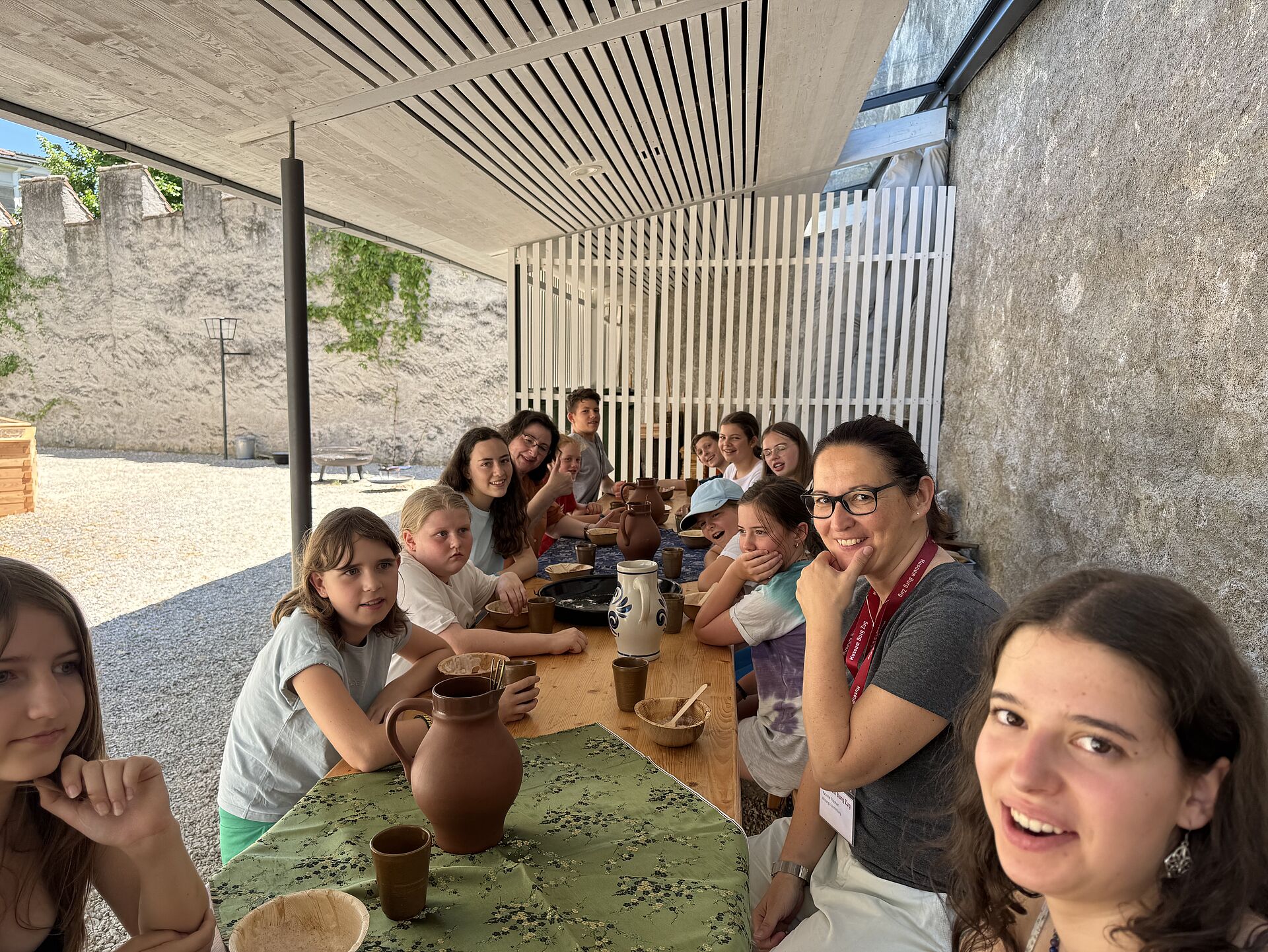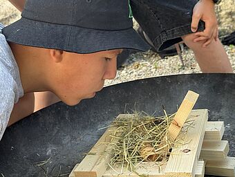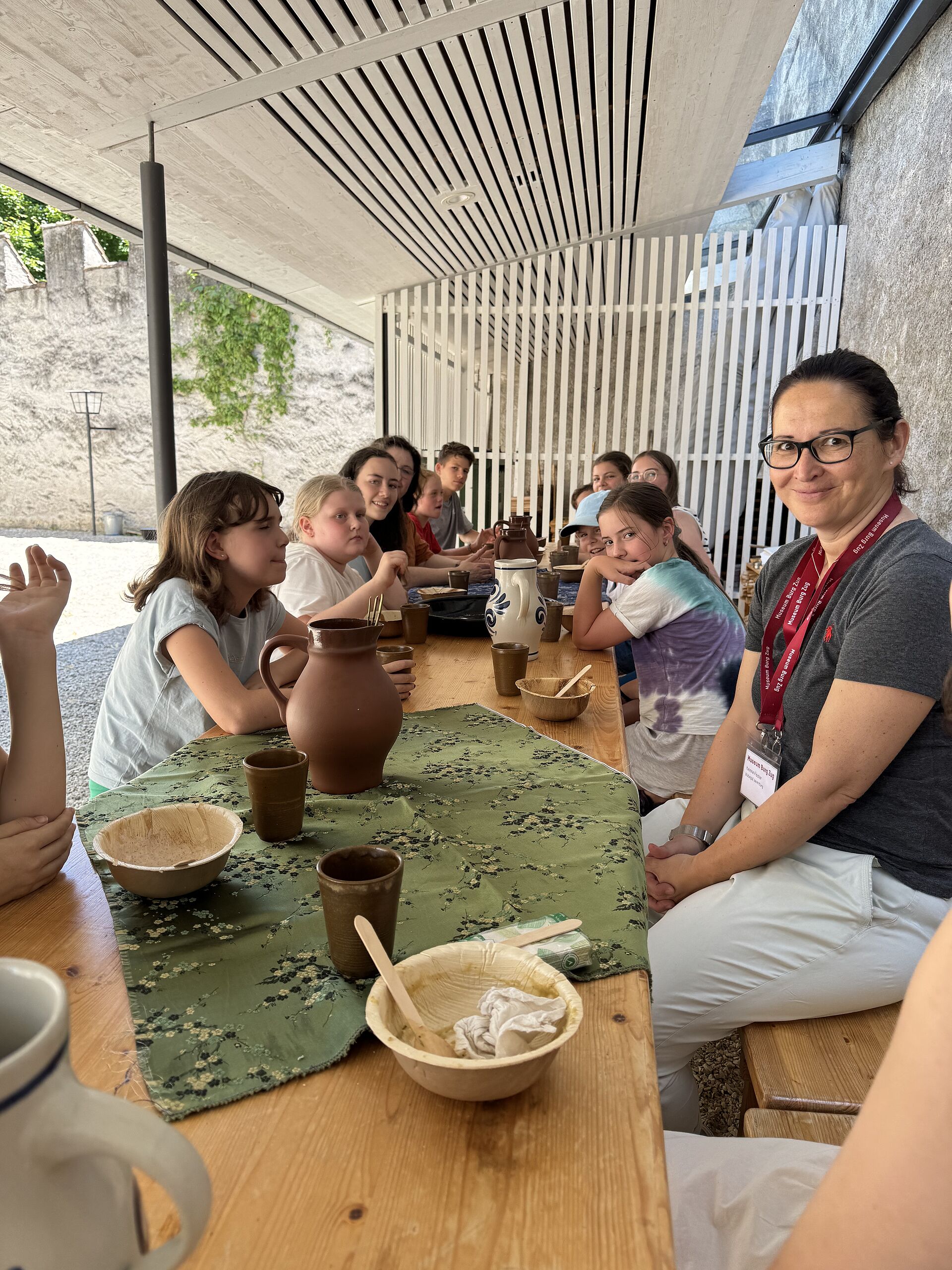 Wie begrüsst man im Mittelalter auf der Burg? Und wie im kleinen Fischerdörfchen Zug? Und wie wird Feuer gemacht für Licht im Raum, fürs Kochen und fürs Heizen? Wobei, das Heizen hätten wir uns bei 32 °C gerne gespart. Aber weil wir auch kochen übten wie im Mittelalter, brauchten wir offenes Feuer ... Das war gar nicht so einfach hin zu bekommen! Mit Feuerstein und Schlageisen wurden Funken geschlagen, die dann mit Zunder und Heu zum kleinen Feuer gefüttert wurden. Wir waren alle froh, als die Jungs es schafften, genug Funken zu schlagen.