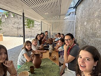Gut gestärkt mit dem Eintopf, der nach nicht viel aussah aber sehr gut schmeckte, dem Fladenbrot, das so schnell weg war, dass wir alle gerne noch mehr gehabt hätten (ausser: das Mahlen der Körner war eben auch sehr viel Arbeit), wurden wir – wie es Brauch war im Mittelalter - mit Rätseln der Gruppe Dessert unterhalten. Dann verschmausten wir das erfrischende Dessert.
