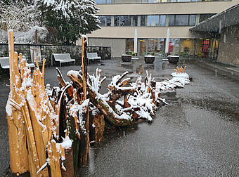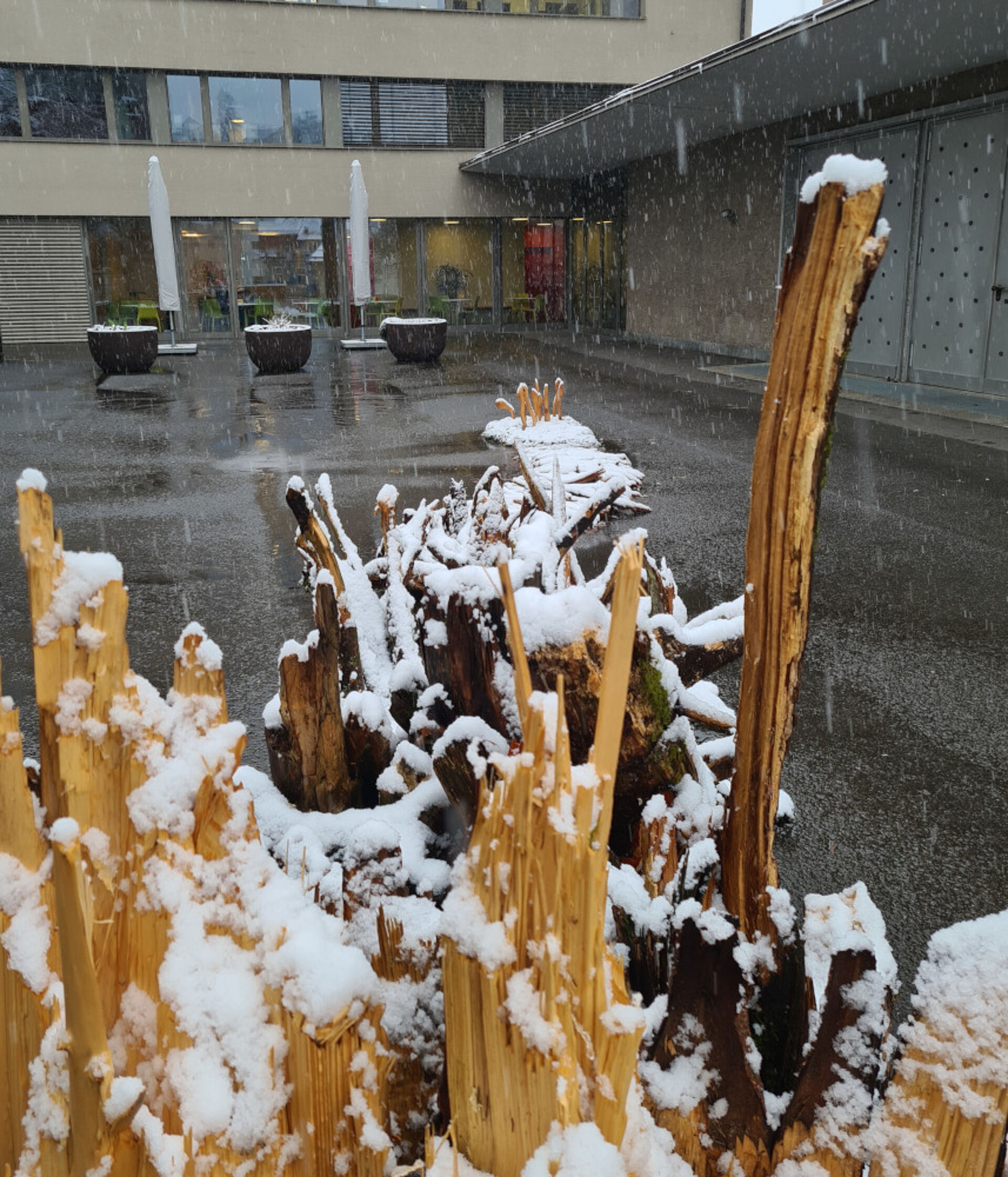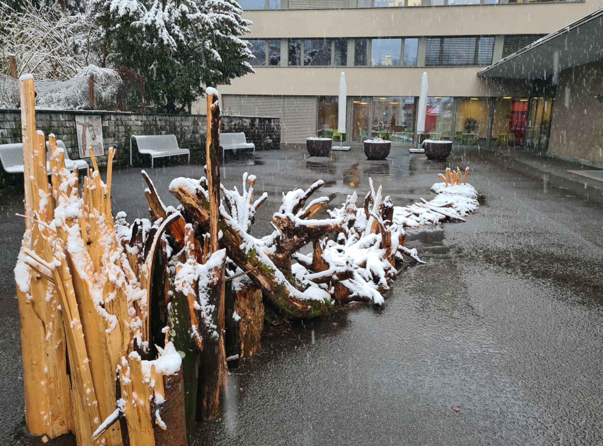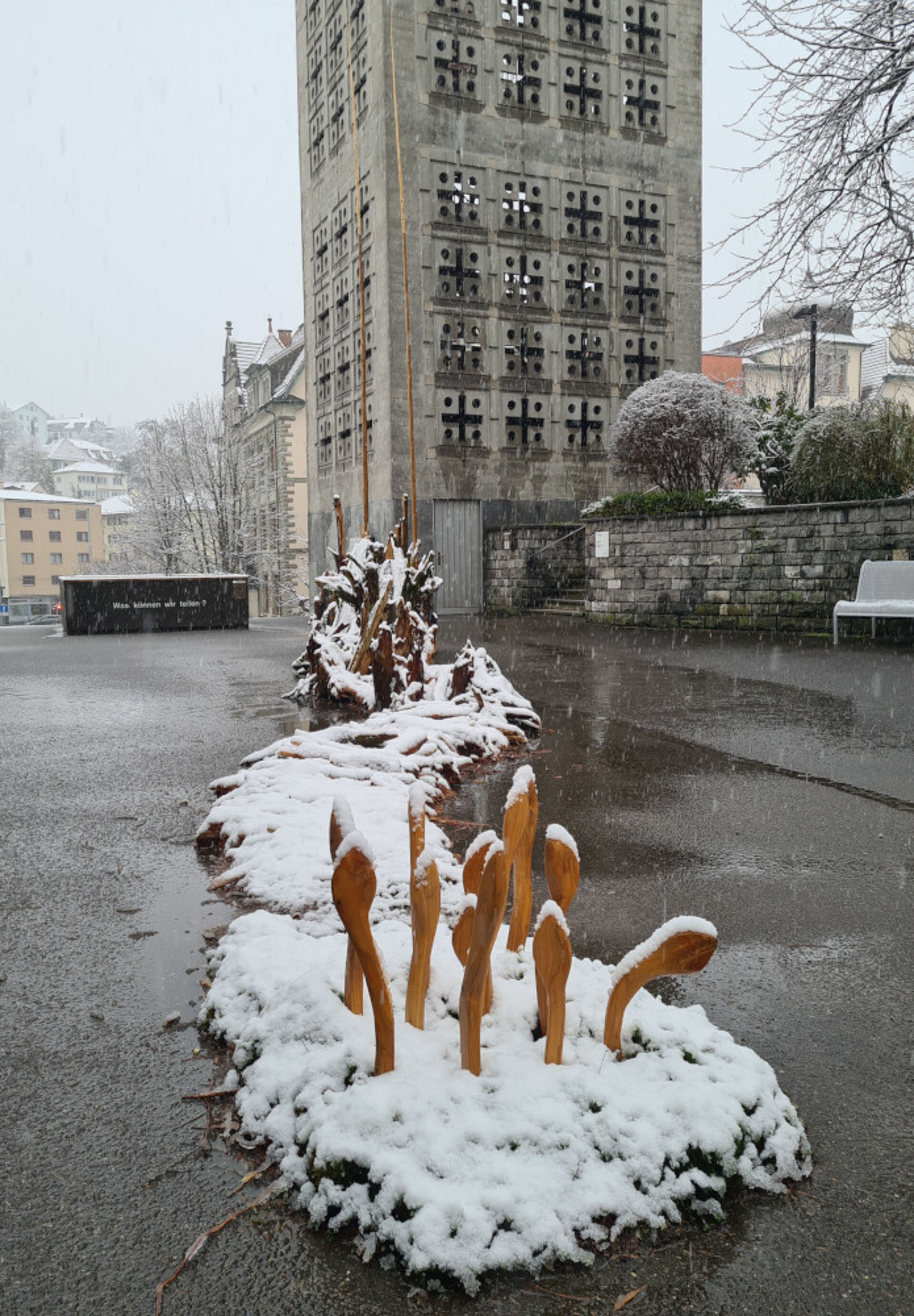 «Zerbrochen – und jetzt…?» Dieser Frage gehen wir in der Fastenzeit mit der Kunstinstallation von Kari Joller auf dem Kirchenplatz, an verschiedenen Mahnfeuern und in den Liturgien nach. (Fotos: Mitarbeitende MaiHof)
